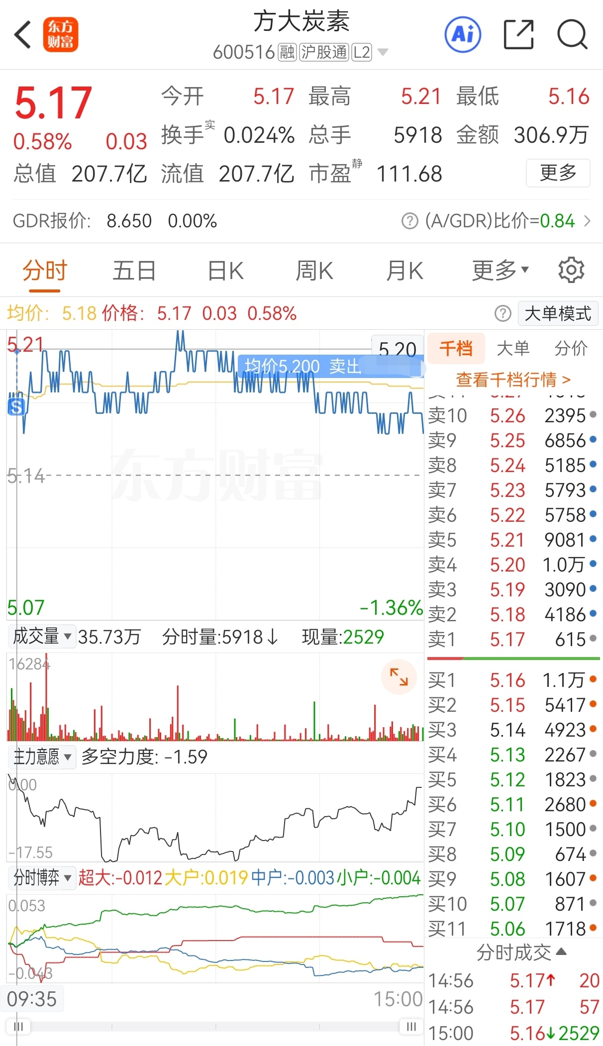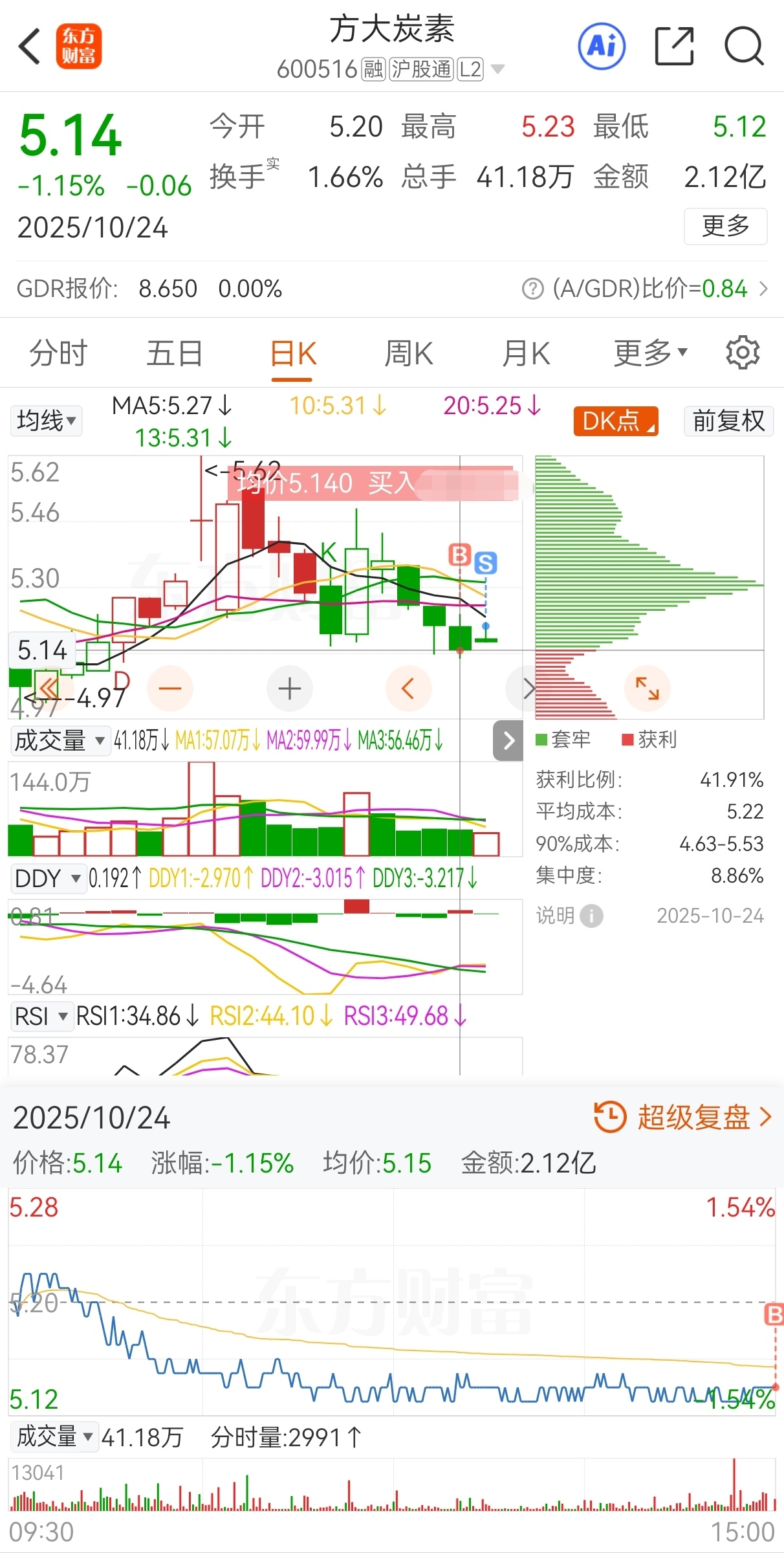 $方大炭素(SH600516)$ 今买明卖,5.14买,5.2卖,实盘隔夜套利方大炭素,成功收米走人!