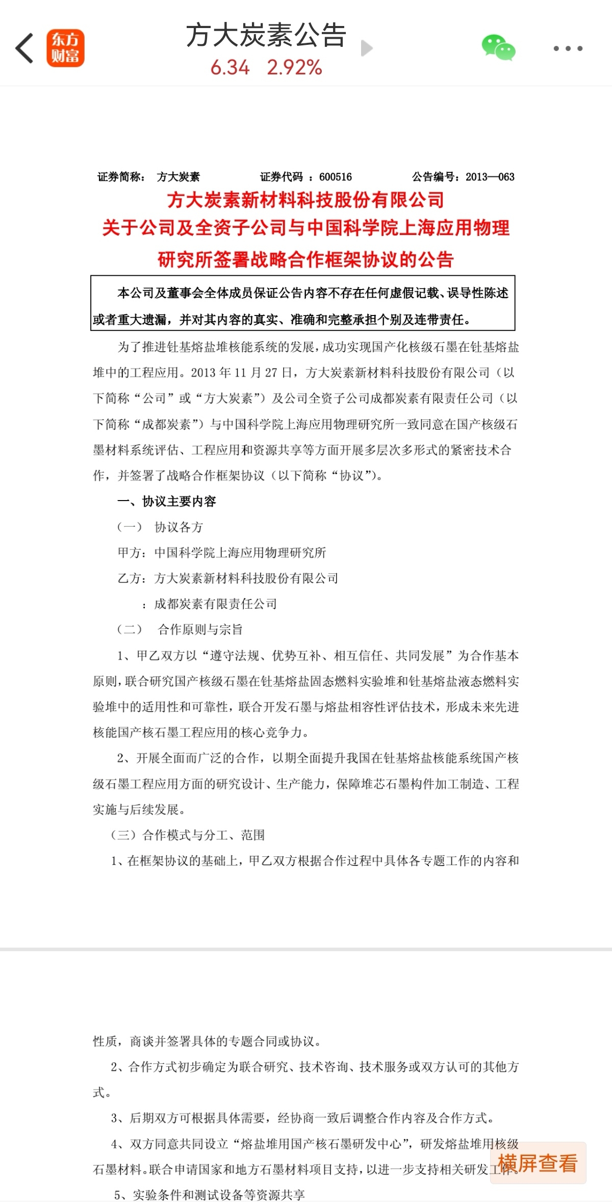 方大炭素是国内具备“钍基熔盐堆”技术专用的“核级石墨”量产能力的两家公司之一。2013年,方大炭素及其全资子公司成都炭素就与中国科学院上海应用物理研究所签署了战略合作框架协议,在国产核级石墨材料系统评估、工程应用和资源共享等方面开展紧密技术合作。