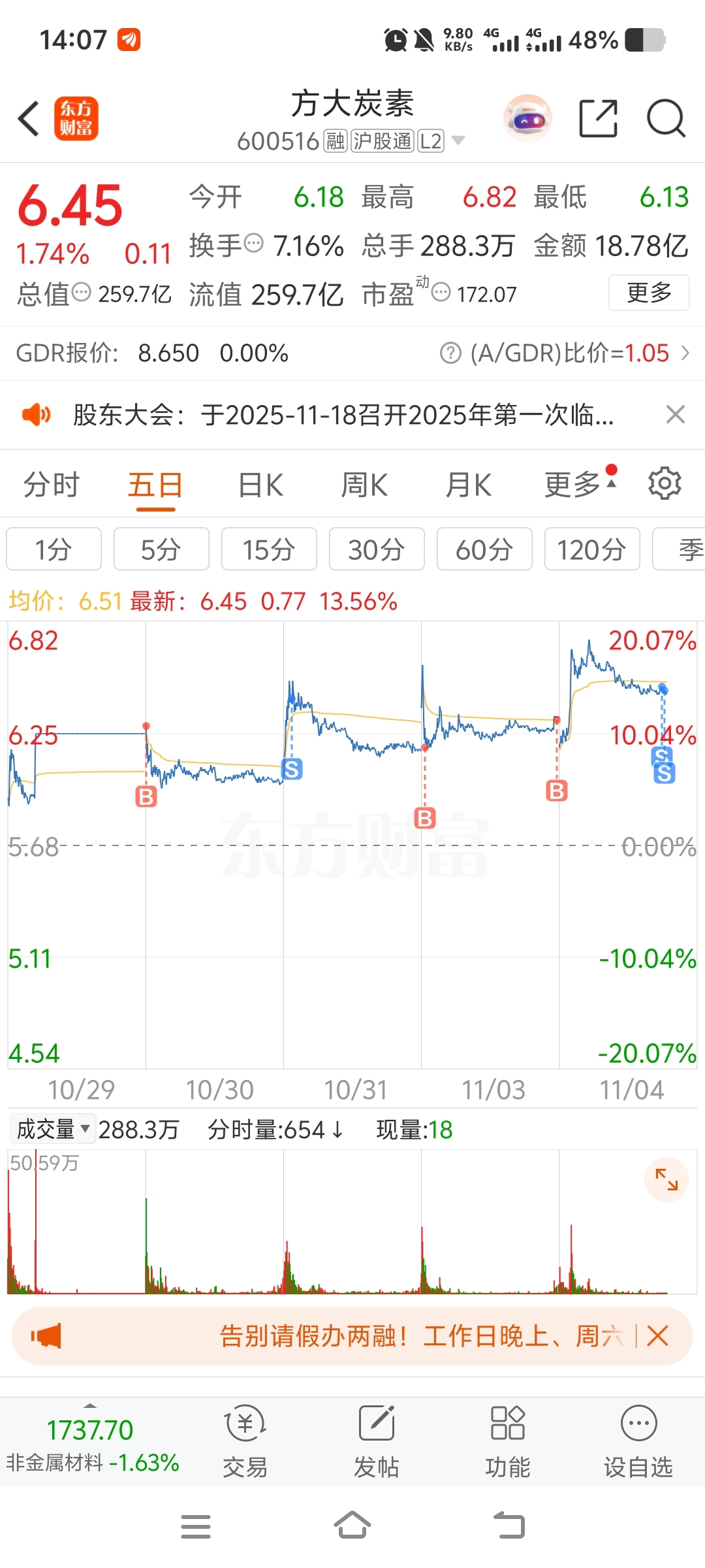 $方大炭素(SH600516)$ 溜了,被板块拖累了,本来这次冲高不会套人,今天的多头变成明天的空头,在利好,题材好也没用,技术层面只能被动调整了,明天抛压释放可以进