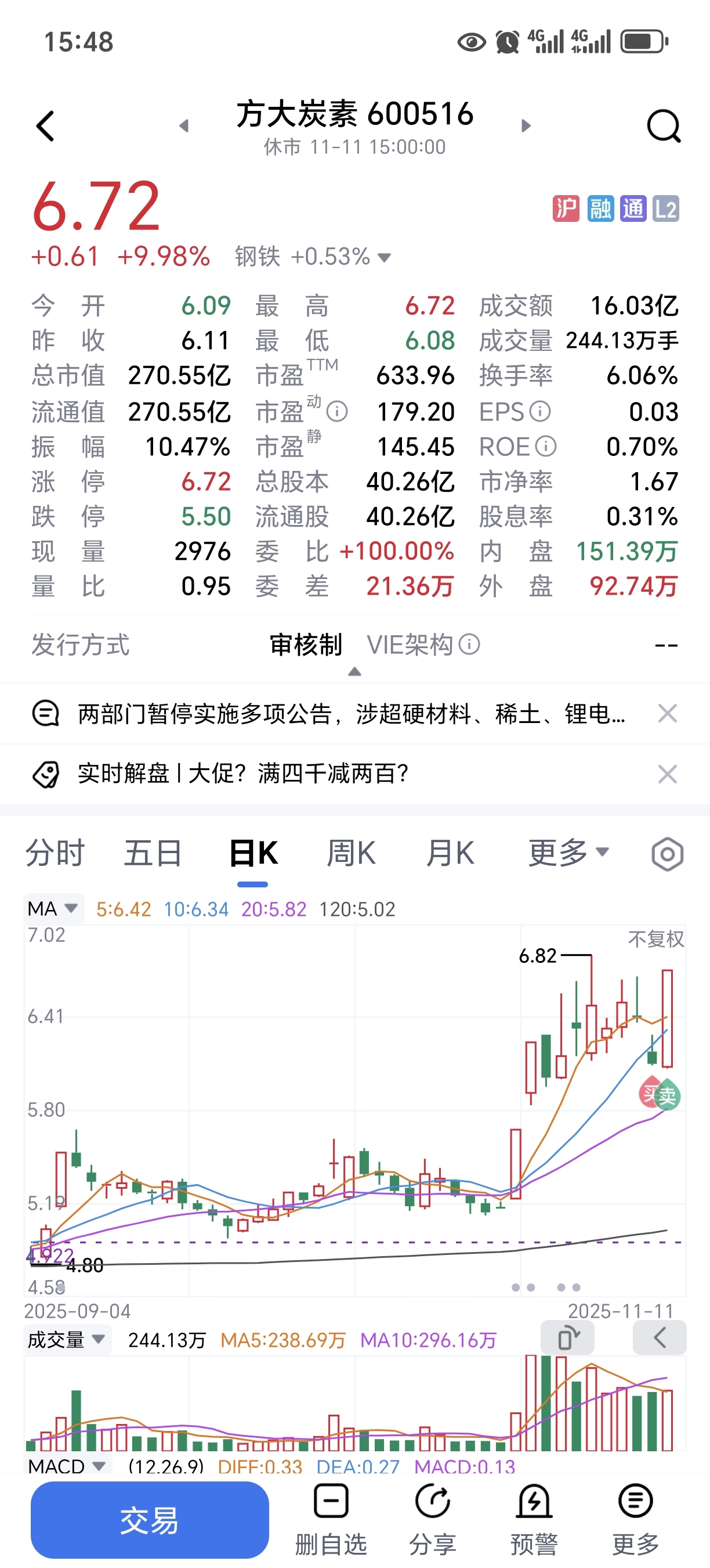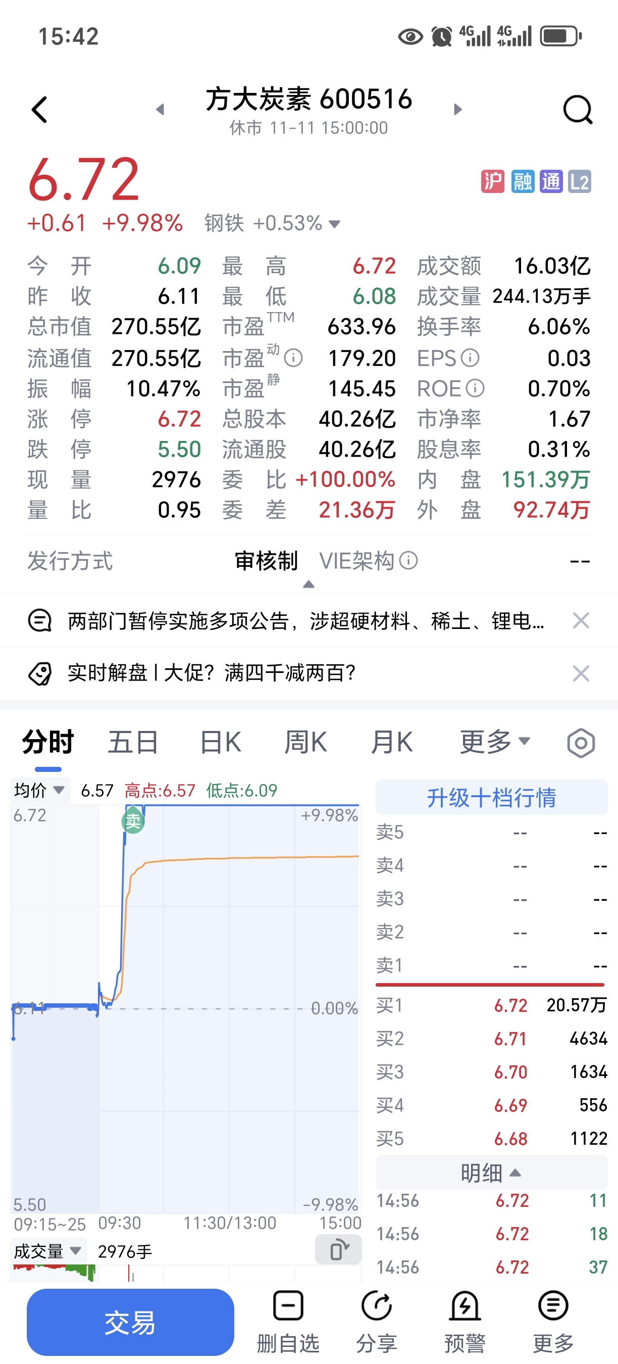 $方大炭素(SH600516)$ 开板时挂了个涨停卖,居然又封涨停了,卖了不知对与错