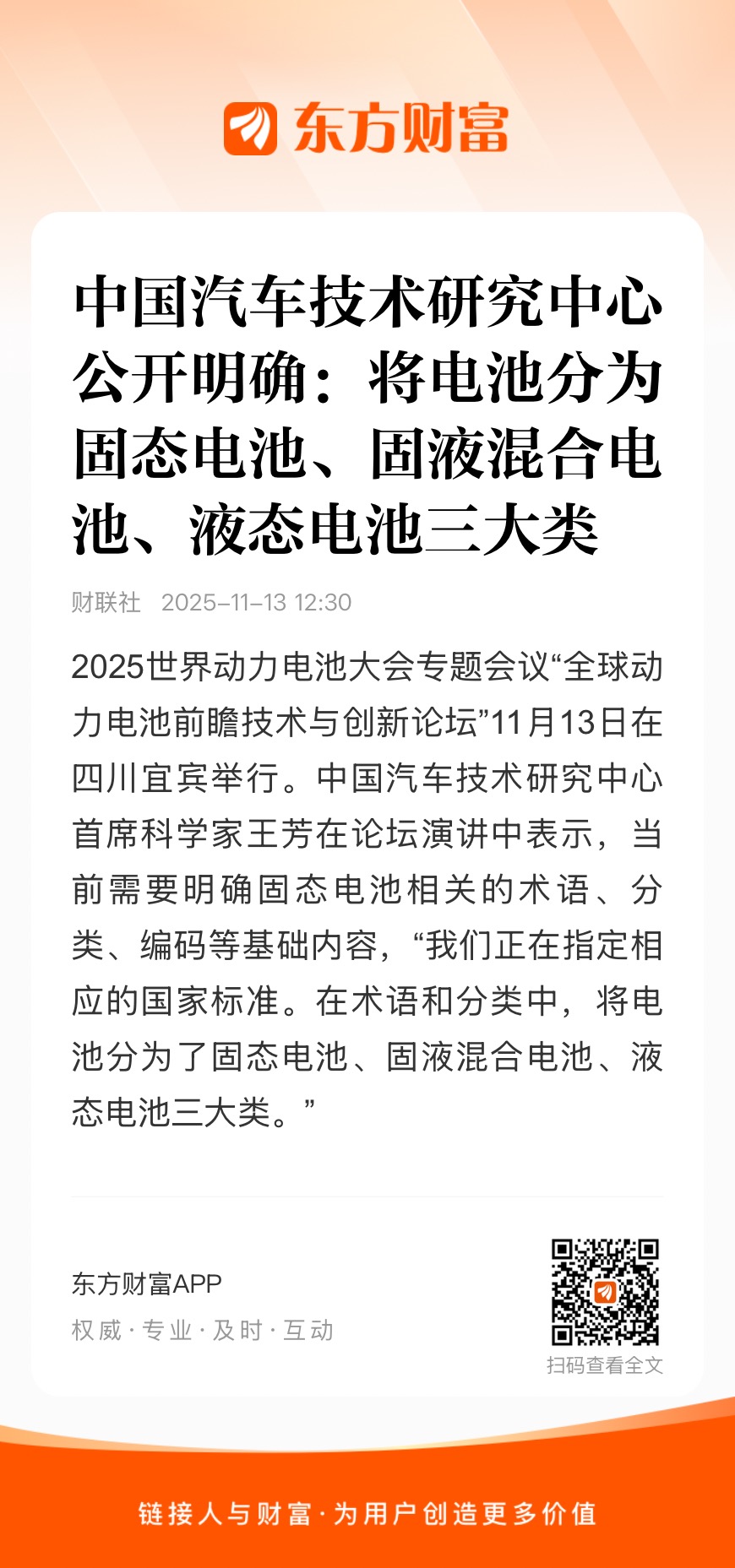 2025世界动力电池大会专题会议“全球动力电池前瞻技术与创新论坛”11月13日在四川宜宾举行。中国汽车技术研究中心首席科学家王芳在论坛演讲中表示,当前需要明确固态电池相关的术语、分类、编码等基础内容,“我们正在制定相应的国家标准。在术语和分类中,将电池分为了固态电池、固液混合电池、液态电池三大类。”