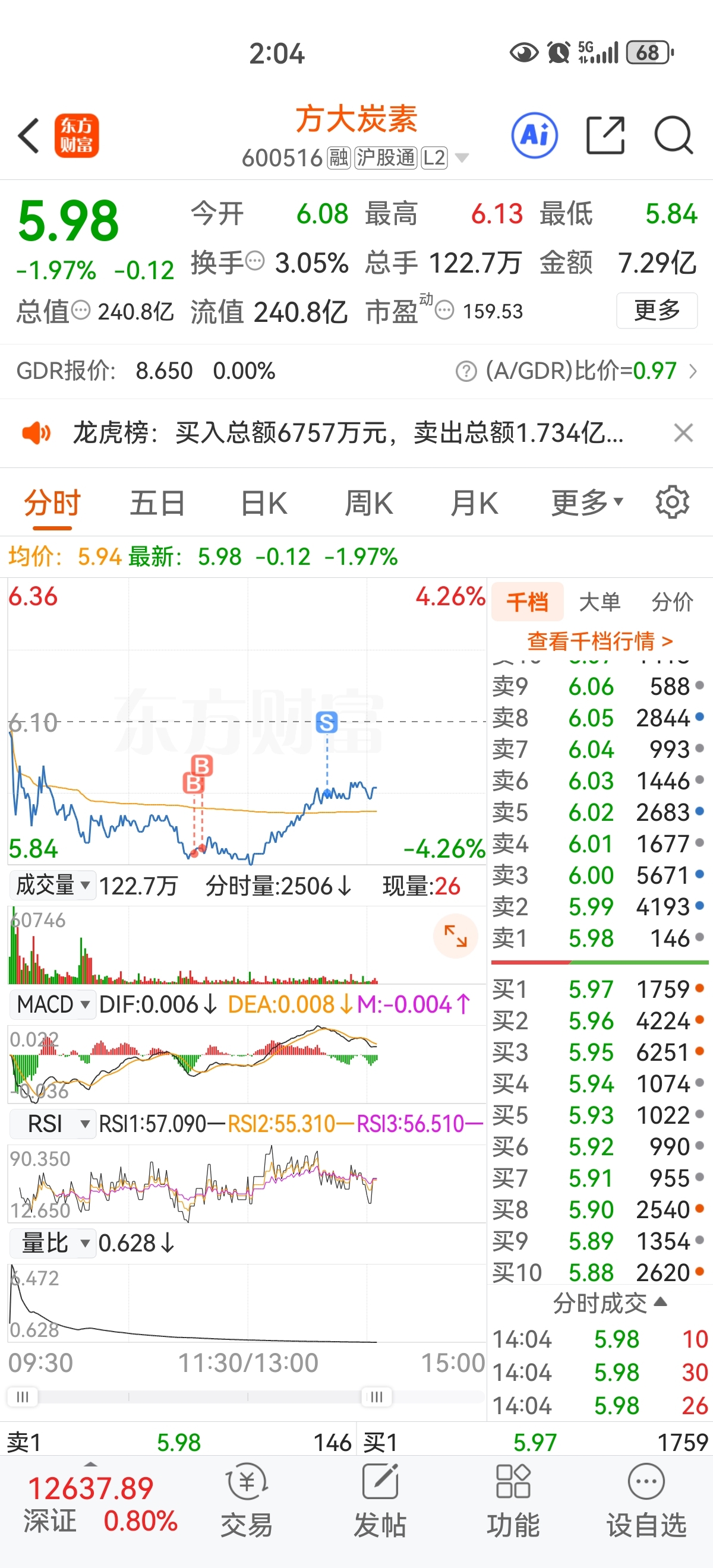 $方大炭素(SH600516)$ 只敢搏一下他超跌反弹降一下成本,后面就不好说了,有人说到5.65,有人说到4.5,不可全信,不可不信。最重要的是在这种零和博弈下降低自己的成本才是王道!!