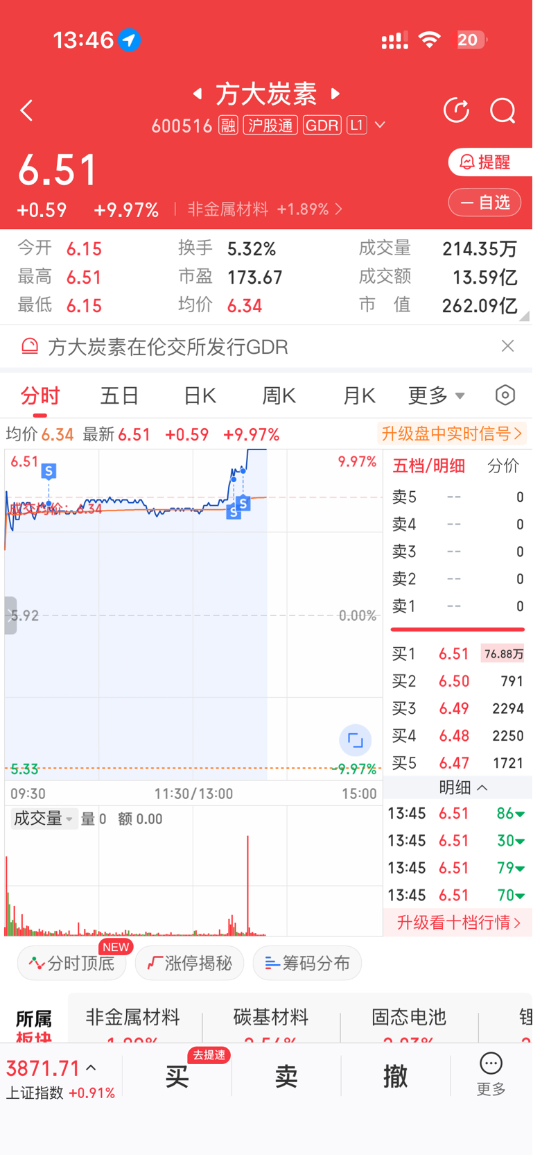$方大炭素(SH600516)$ 我丢,卖了你就涨停,一会就炸,明天低开