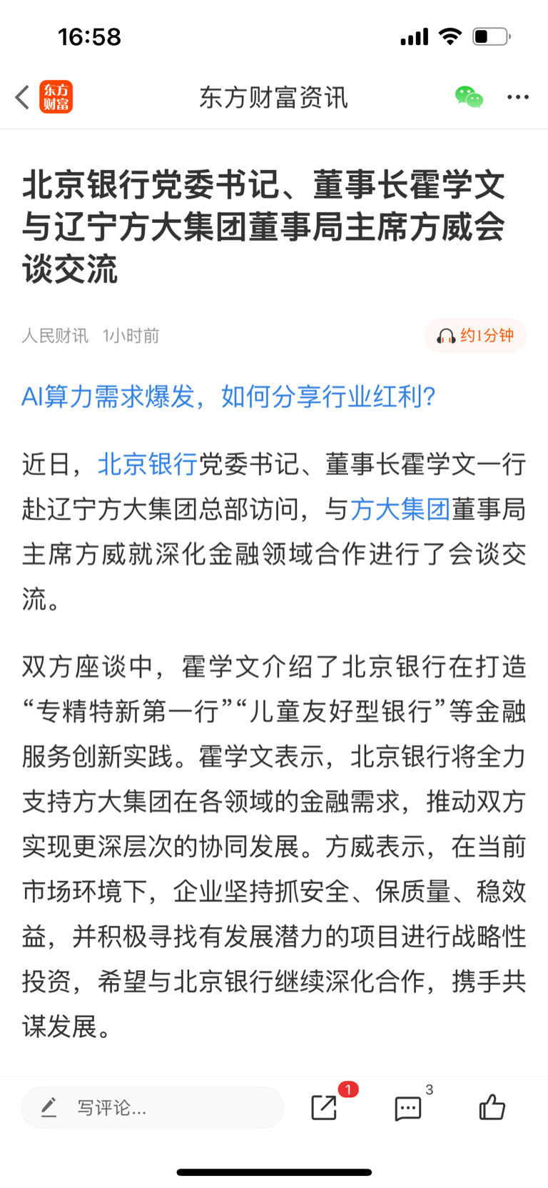 $方大炭素(SH600516)$ 北京银行将全力支持方大集团在各领域的金融需求
