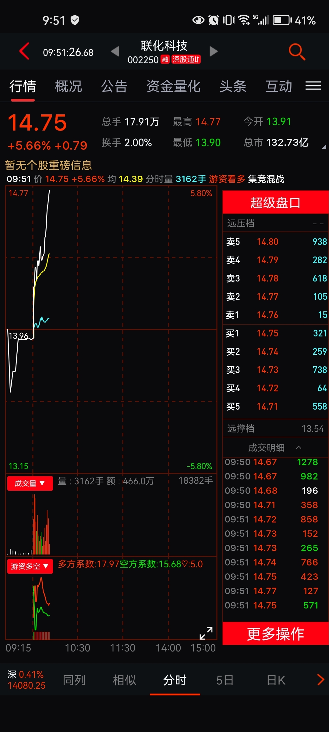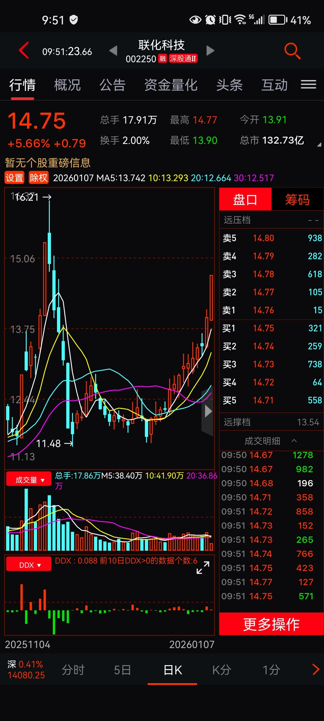 兄弟们,赶紧过来看看联化科技来吧,短期不论从基本面,上升趋势,题材都好过方大。我