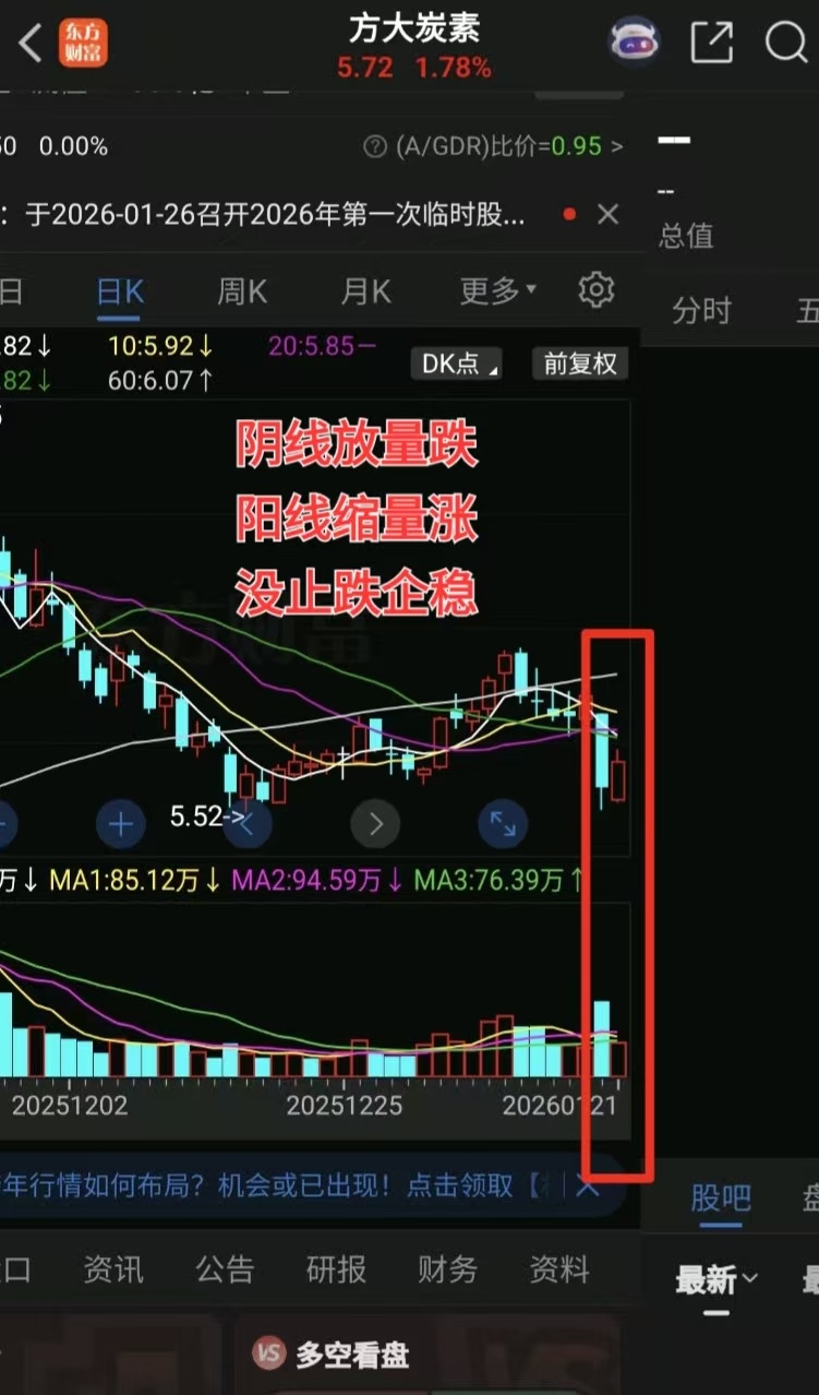 有粉丝问:昨天方大分时图上,股价没创新低而且收阳,是否止跌企稳了?前天日线收的是