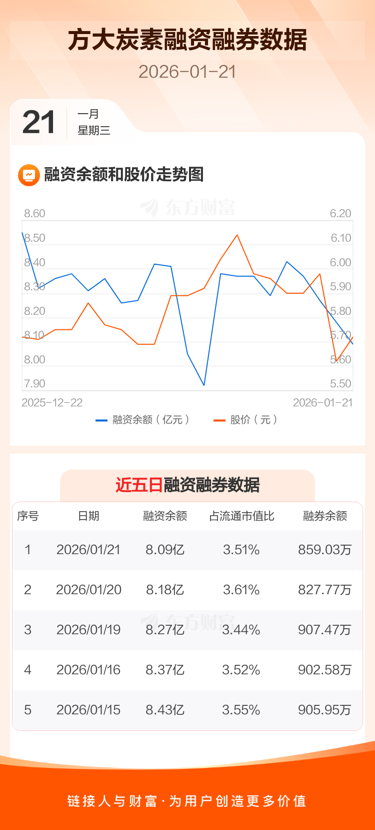 交易所最新数据显示,方大炭素于2026年1月21日获融资买入3528.44万元,融资偿还4449.03万元,当日融资净偿还920.6万元。目前,该股融资余额8.09亿,占流通市值比例为3.51%。