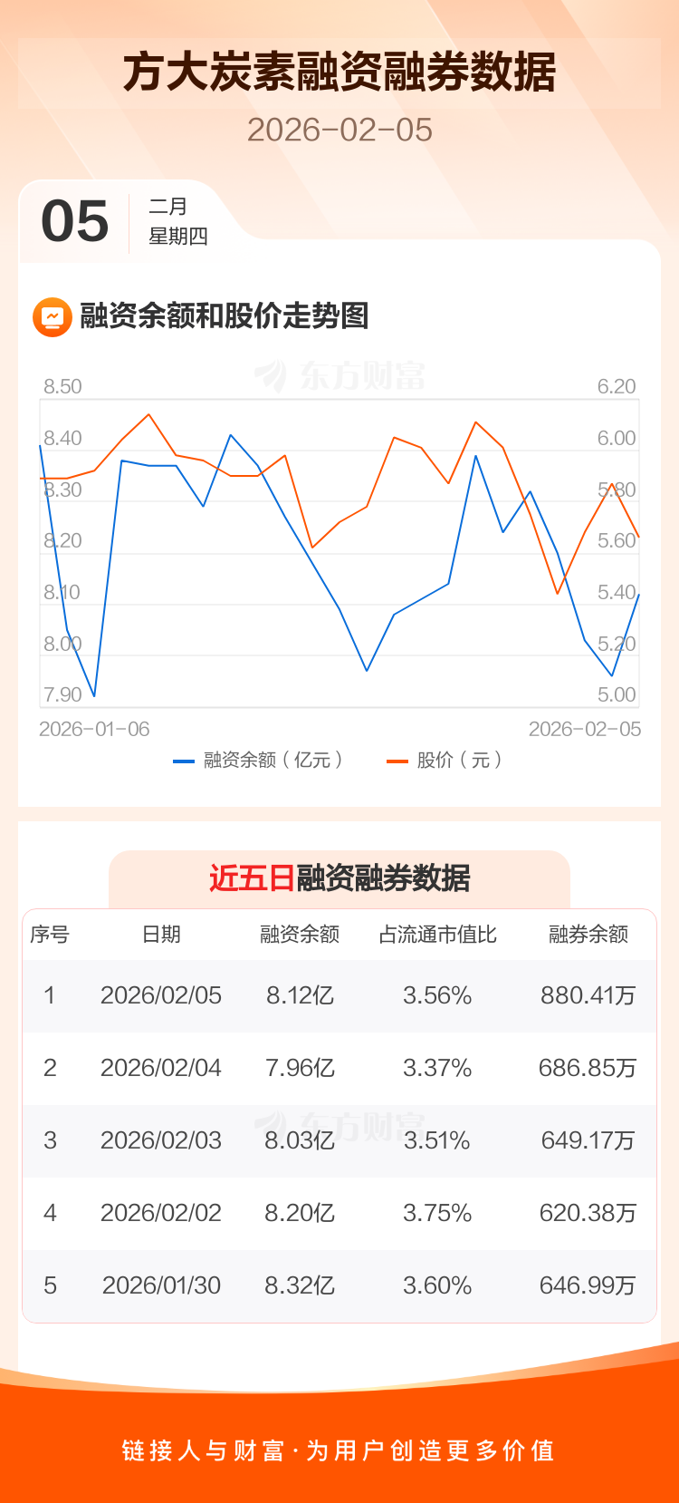 交易所最新数据显示,方大炭素于2026年2月5日获融资买入3793.67万元,融资偿还2261.34万元,当日融资净买入1532.34万元。目前,该股融资余额8.12亿,占流通市值比例为3.56%。