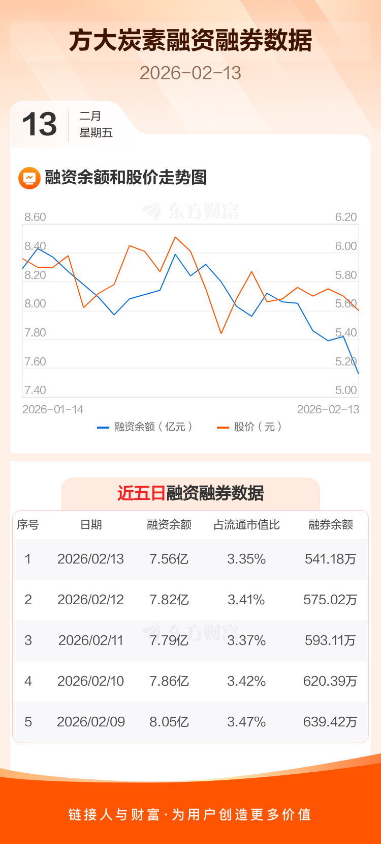 交易所最新数据显示,方大炭素于2026年2月13日获融资买入1678.77万元,融资偿还4275.32万元,当日融资净偿还2596.54万元。目前,该股融资余额7.56亿,占流通市值比例为3.35%。