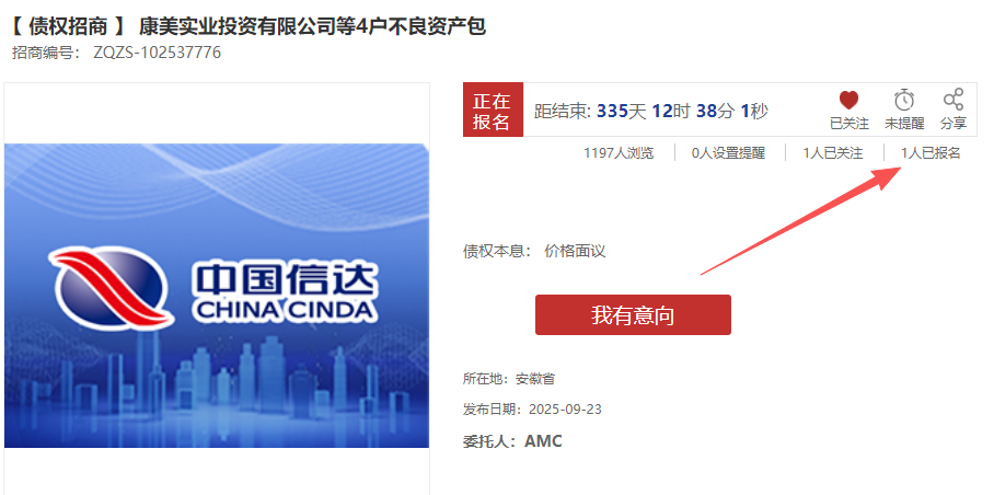 百昌拍卖平台的康美实业投资有限公司等4户不良资产包已经有1人报名,价格面议,会不