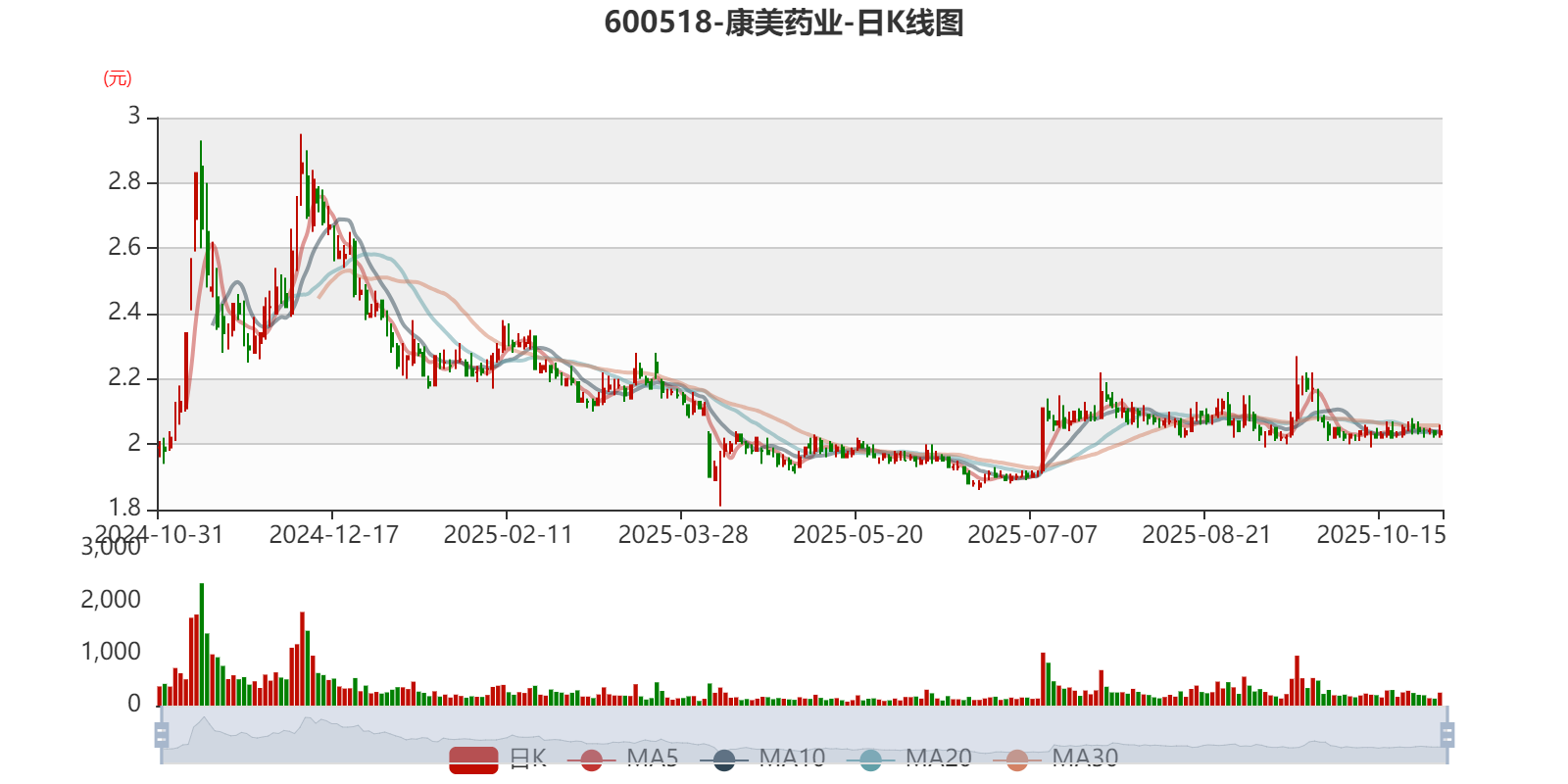 中证智能财讯康美药业(600518)10月31日披露2025年第三季度报告。前三季度公司实现营业总收入39.6亿元,同比增长2.22%;归母净利润1308.23万元,同比增长160.84%;扣非净利润亏损3793.67万元,上年同期亏损1.8亿元;经营活动产生的现金流量净额为1.38亿元,上年同期为-3.5亿元;报告期内,康美药业基本每股收益为0.001元,加权平均净资产收益率为0.18%。