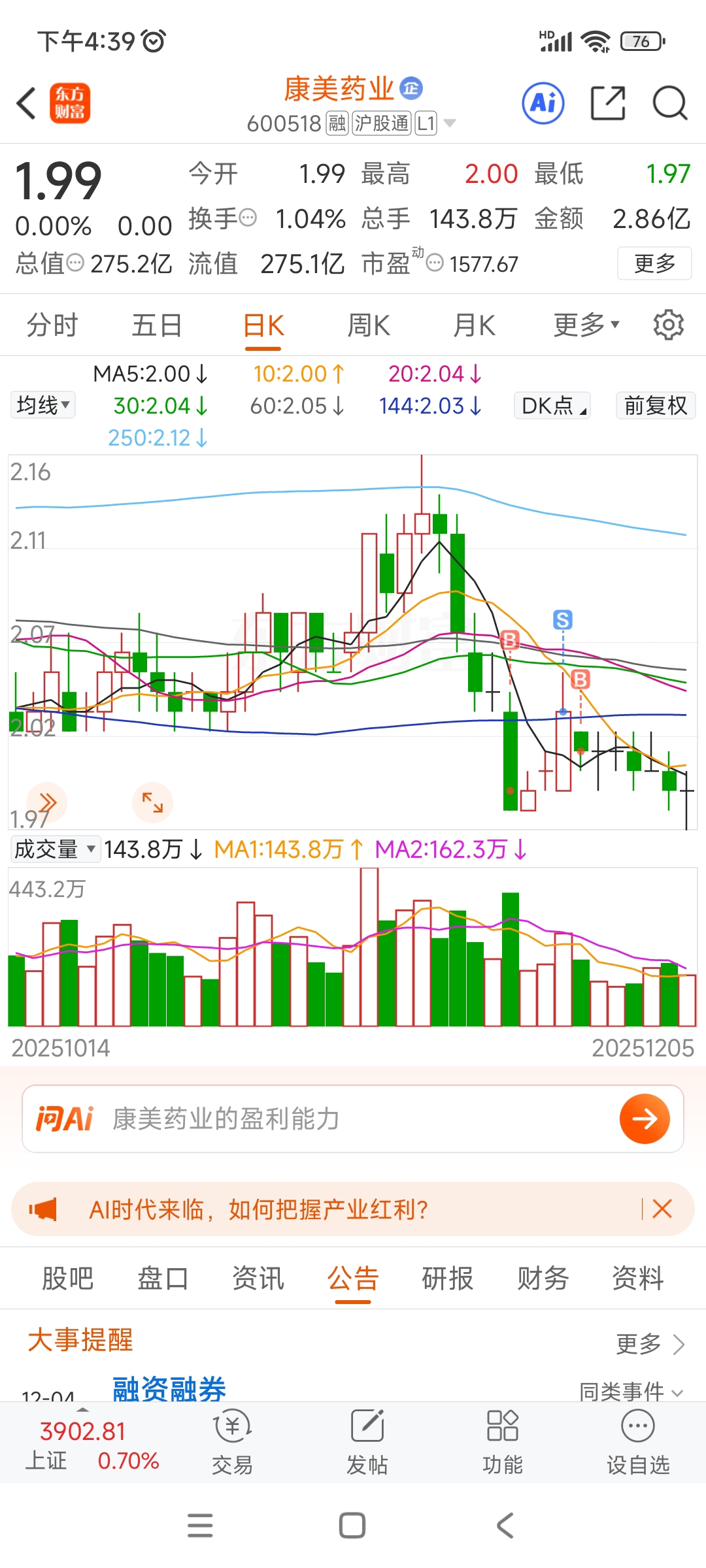 $康美药业(SH600518)$ 兄弟们,星尘11月21日1.99买了糠霉,后来2.03卖了,2.01又接回来了,一直到今天也没动,耐心等待花开