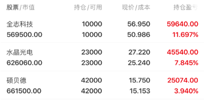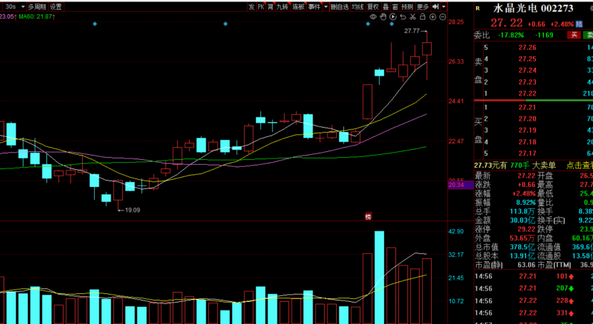 水晶光电002273,消费电子、AI眼镜概念股,老李上周五新介入的强势品种,计划做主升浪。昨天的走势跌全志有点像,当然水晶光电反弹来得更猛一点,下午最高拉升到了4.5%。