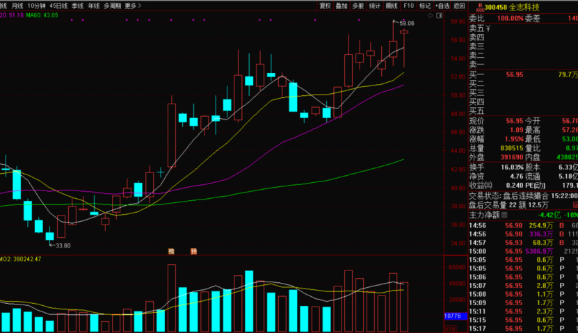 全志科技300458,芯片概念股,中线品种,中线的逻辑是全志科技年报业绩大增7倍,并涉及时下所有科技类的热点,今年是科技大年,结合它的强趋势,计划中线持股。昨天早盘高开低走,盘中一道跳水达5%,但老打算出货,这一点之前文章已经强调过,计划中线持股,做中线是肯定要扛阴线的,扛住阴线就必须对它的上涨行情很有信心,而且它的走势又符合你的分析预期,做中线要这样才行。最怕的就是你分析的信心很足,下跌扛住了,结果它一直跌,你继续扛,最后深套了。这就是分析与实际不符,原来的分析根本就是错误的,很多人买了一只股票套了,就会找理由看好它,麻木自己的风险意识,本小亏5%就可以止损,结果找利好的理由把自己亏损了60%。做中线只做它趋势向上拉升的阶段,回调极限是不破20日线,昨天全志的走势体现我对它强势的分析,中午就开始绝地反击,收盘反涨1.95%。