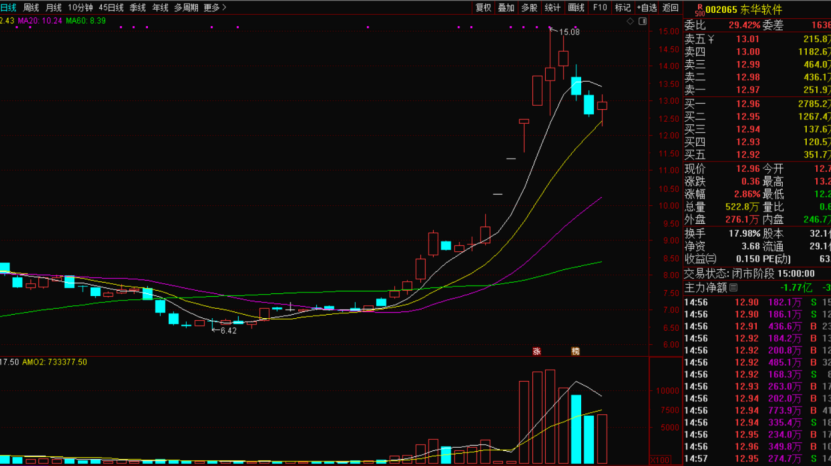 $东华软件(SZ002065)$东华软件002065,DeepSeek概念龙头股,该股是年后最有操作价值的DeepSeek概念股,因涨幅太大,近几天在高位出现两条大阴线刹跌,昨天止跌收星,早盘跌破10日线后放巨量拉升反弹,下午一直在红盘震荡,收盘涨2.86%,从分时上看,它下午的走势很稳,没有再出现急速放量的下跌,因来从它顶部的K线看,主力在顶部出货的运作时间短,是尖顶,所以有继续震荡出货的要求,老李喜欢抄底这种牛股的回踩,前期的杭钢、长盛轴盛都是成功的,每次都有20CM。
