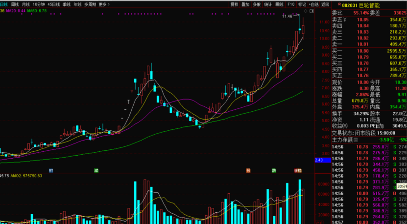 $巨轮智能(SZ002031)$巨轮智能002031,人形机器人龙头股,周三巨轮冲高回落,收长上影的阴十字星,并放巨量,见顶的技术走势十分明显。昨天早盘果然出现大跌,但奇怪的事出现在2点30分,这时忽然出现大单拉升,股价最高涨7.65%,收盘涨2.86%,相当于解放了周三的,这么一涨明白了,见顶是假的,实则在建仓盘。巨轮极其活跃,两天换手竟然达75%,主力完全可以高位拉盘快速拿到货,明天就可以继续拉升了。