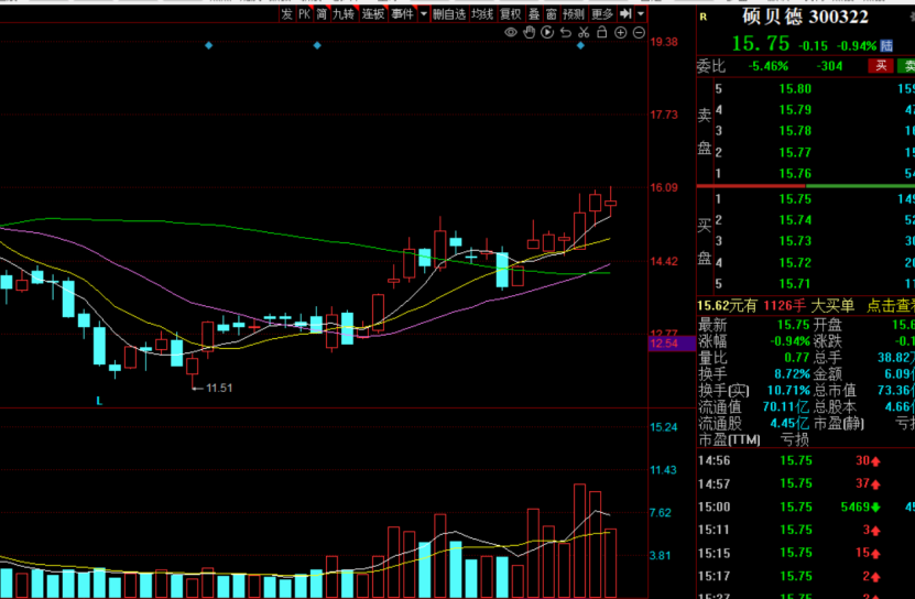 硕贝德300322,华为、5G、消费电子概念。昨天还在持股,微跌0.94%,收盘红色低开的十字星,成交量萎缩,这个K线老李认为是对抗大盘震荡行情的一个上涨中继,也是对昨天长下影线的消化。