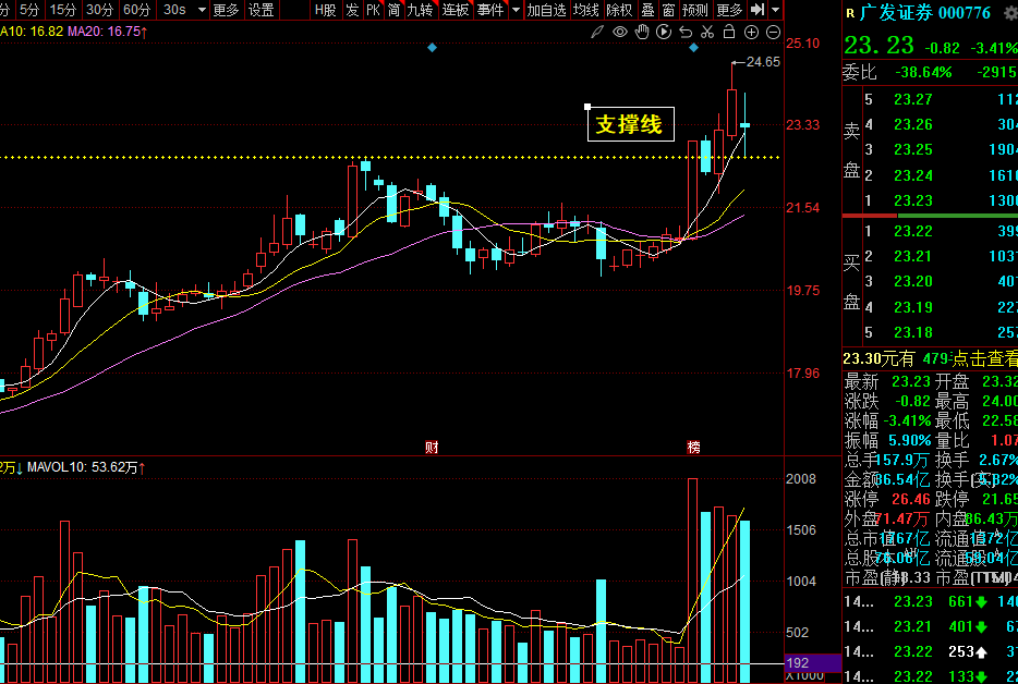 广发证券:券商与我们大盘指数的涨跌息息相关,接下来冲击4000点,券商是不可或缺的方向。广发目前正在走主升浪行情,主力正在稳扎稳打,一步一个脚印在底部构筑了一个W型的双底形态,9月29日,一个涨停板突破左锋高点之后,下方形成堆量,股价沿着5日线走上升趋势,在今天收出一个十字星,下影线回踩支撑不破,主利控盘非常的稳,下方明显是有强支撑的,并且收盘回到了5日线的上方,接下来广发有望继续沿着五日线走趋势。