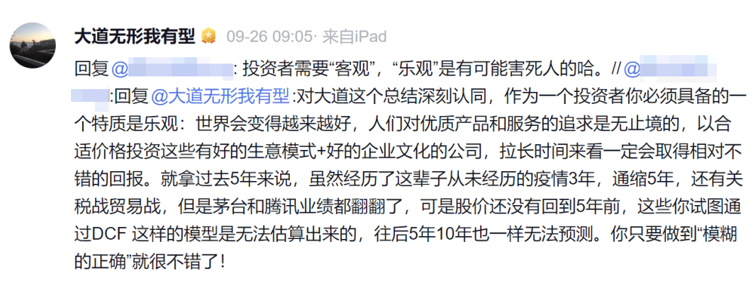 今年9月26日,有网友表示,茅台和腾讯业绩都翻番了,可是股价还没有回到5年前。段永平回复说:“投资者需要‘客观’,‘乐观’是有可能害死人的哈。”
