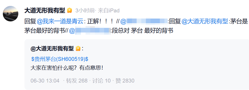 事实上,今年6月30日,在贵州茅台调整时,段永平便发帖称:“(对贵州茅台)大家在害怕什么呢?有点意思!”