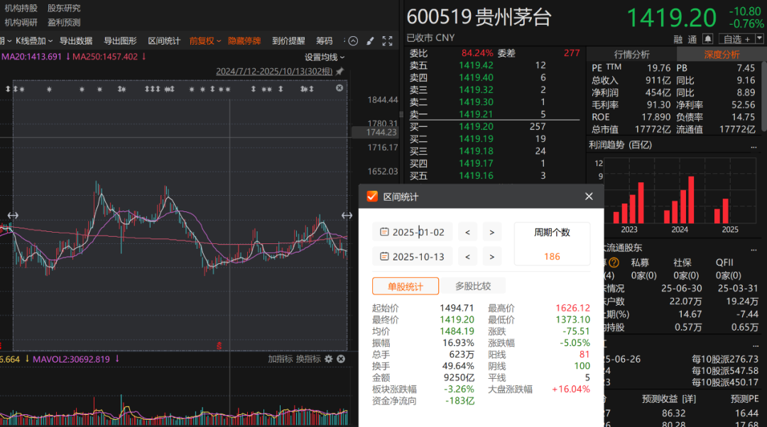 从股价走势看,贵州茅台今年以来表现欠佳。截至10月13日,公司年内股价跌幅超过5%。
