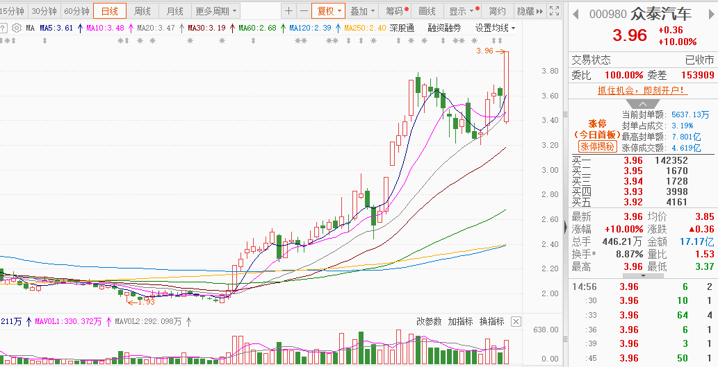 众泰汽车:汽车零部件,该板块是10月胜率连续5年达到100%的赛道,胜率摆在这,所以该股周一修复反包一点不意外,反包后首板涨停,奋斗干5600多万,股价放量涨停突破前高3.8的压力,上涨趋势延续,还有空间,加上板块的胜率,可以逢低低息。