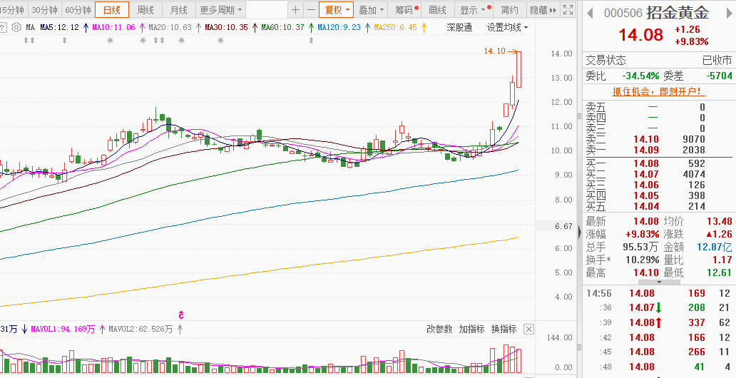 招金黄金:黄金概念,周一低开震荡拉升,临近收盘接近涨停,虽然没有涨停,但股价从突破新高后加速拉升,本身今天黑天鹅普跌,避险情绪息引兹金,所以大涨不意外,还有继续拉升空间。