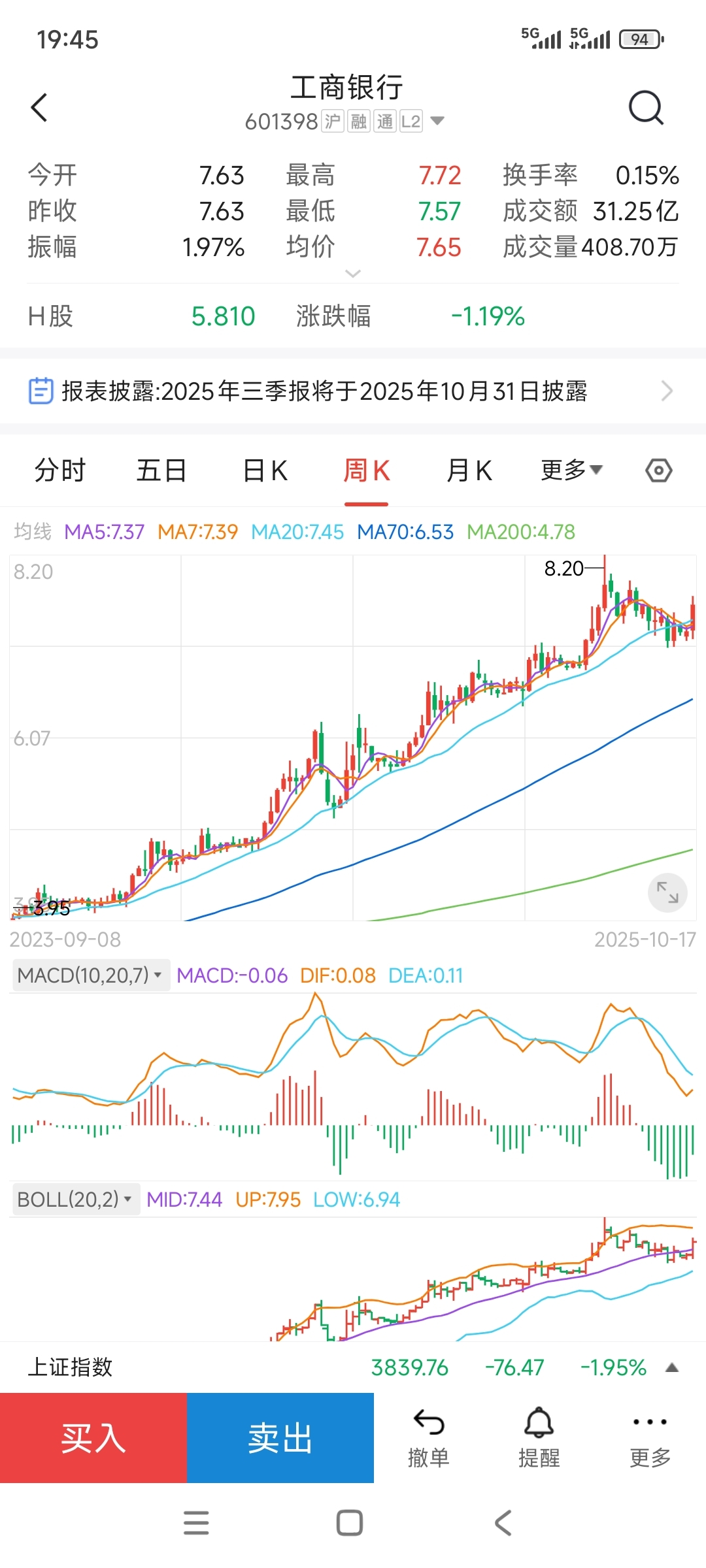 1)银行,等大盘在这次调整中护盘,它也就完成周线的冲顶的动作了。以工商银行为例,