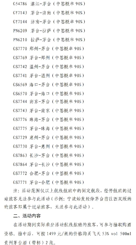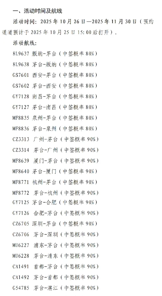 根据公告,10月26日—11月30日,乘坐指定航线航班的旅客可参与抽取购酒资格,抽中后,不仅可按1499元官方指导价预约购买53度飞天茅台2瓶,对应中签率分别提升至80%和90%。