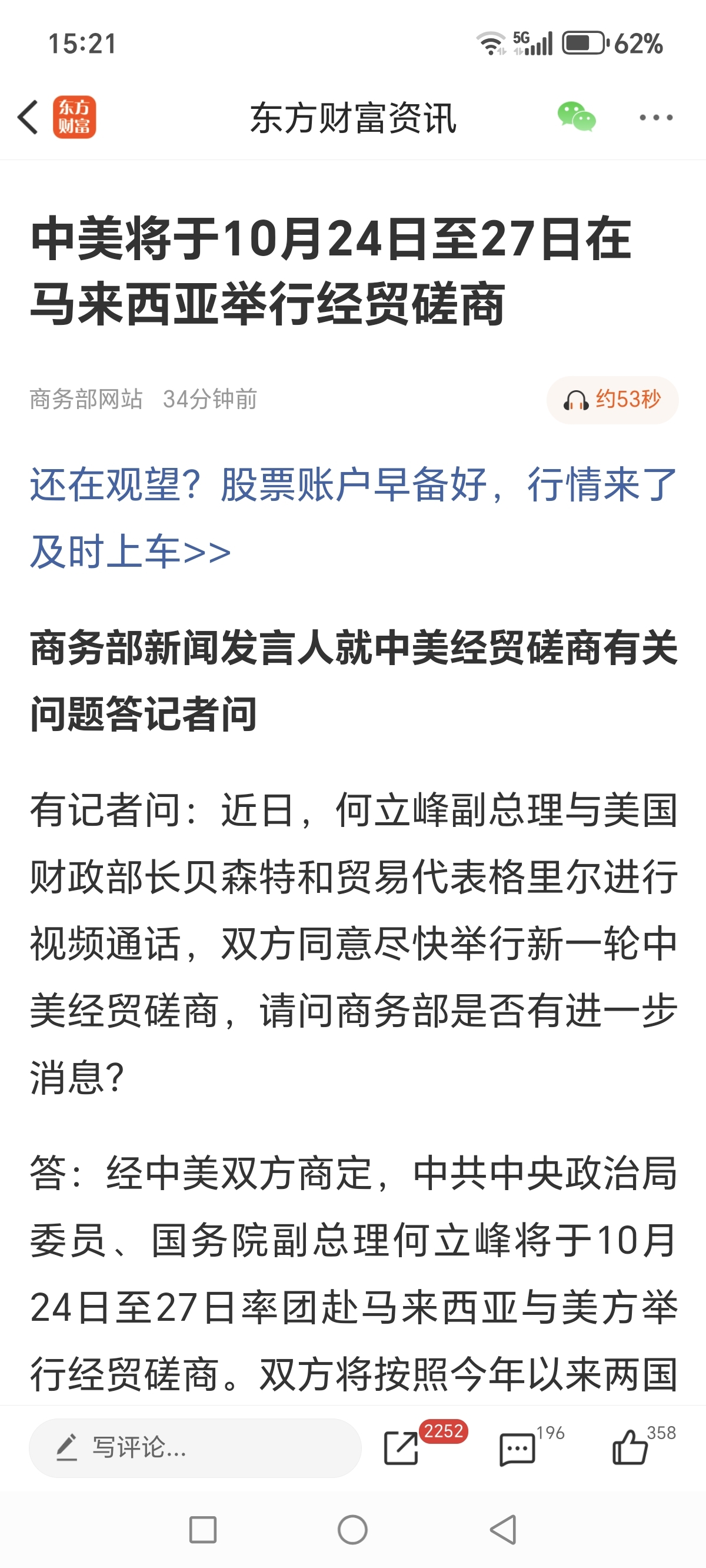 难怪大盘下午1:45之后原地起飞大涨!原来是有利好消息!中美将于10月24日至2