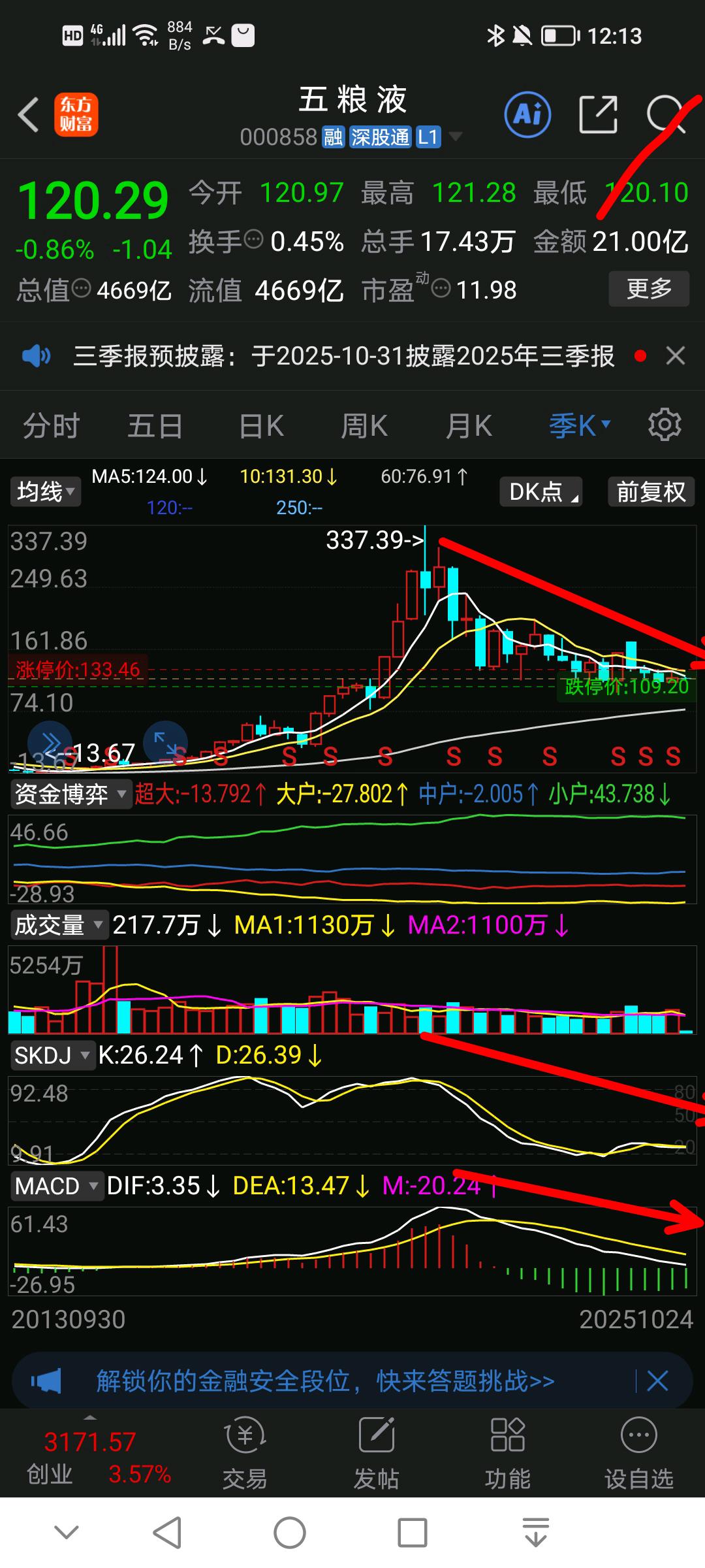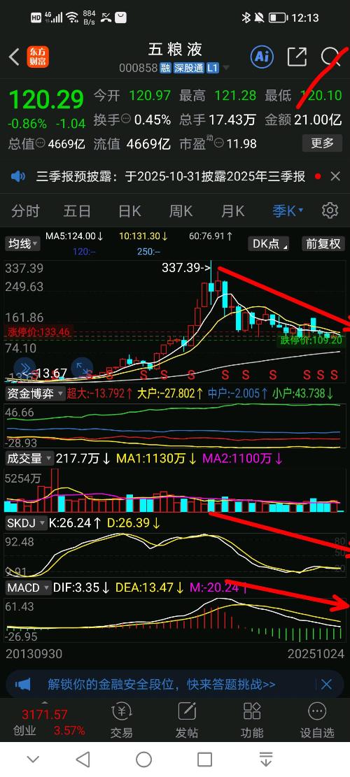 让白酒涨?也是比较困难的…白酒估值低,基金的话?普遍大盘股跌幅不太大,这样保守上涨空间就变小了?他要是涨幅空间变大?就要突破整个历史最高点去打开上涨空间,获得尽可能更大上涨空间?茅台跌幅多大?估计最大接近60%,50%多五粮液多大?跌幅更大一点,但是70%都没有,估计60%不到看看五粮液?跌幅小,长周期技术面还呈现下跌调整趋势?如果不跌,就是要震荡,结局就是抄底却没有像样的上涨?