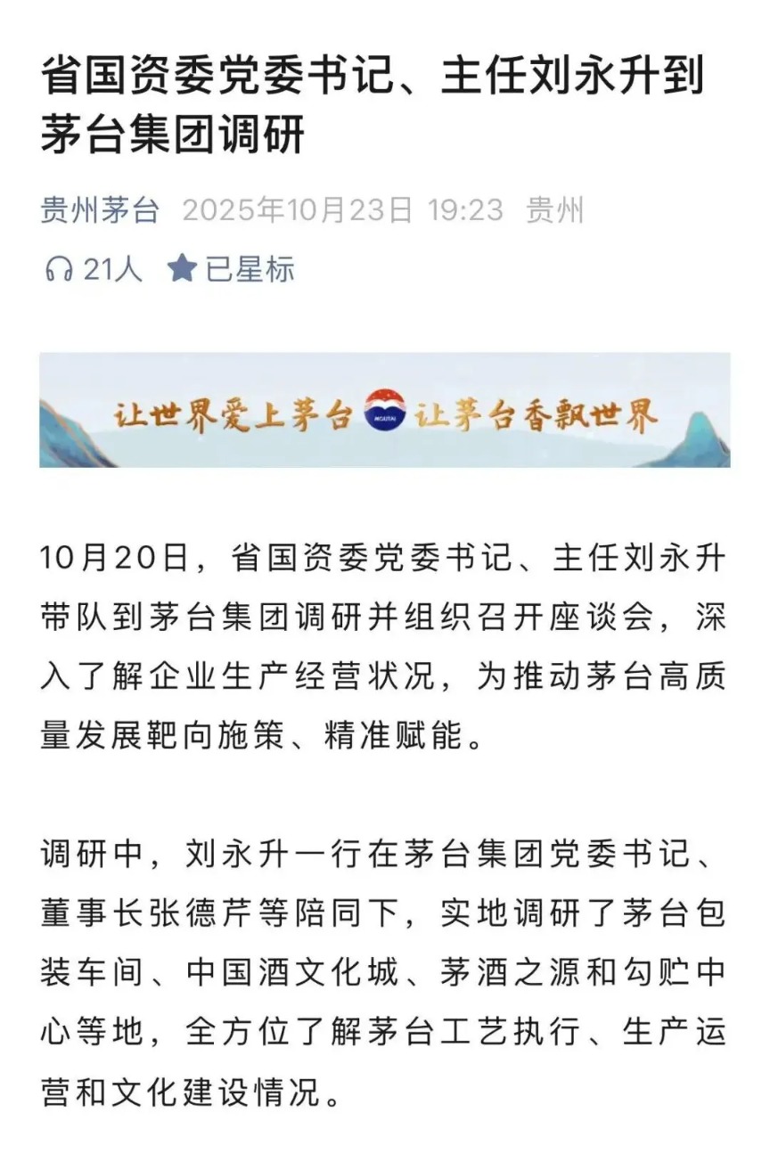 据贵州茅台消息,10月20日,贵州省国资委党委书记、主任刘永升带队到茅台集团调研并组织召开座谈会,张德芹出席。