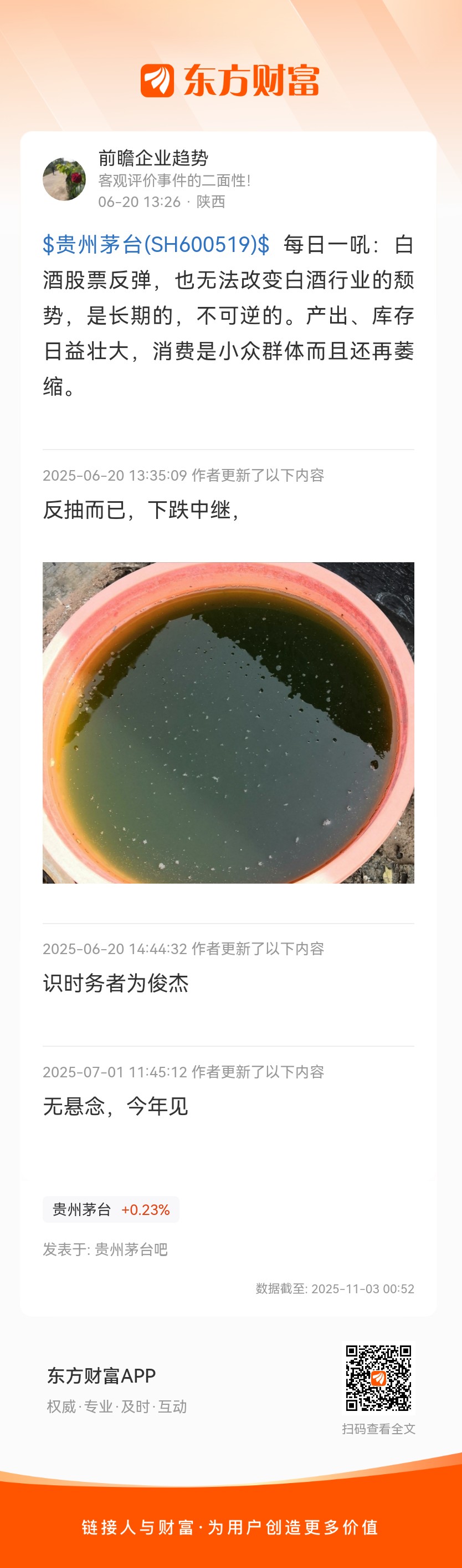 $贵州茅台(SH600519)$ 每日一吼:白酒股票反弹,也无法改变白酒行业的颓势,是长期的,不可逆的。产出、库存日益壮大,消费是小众群体而且还再萎缩。