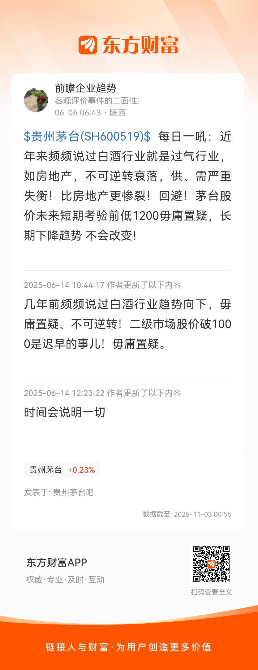 $贵州茅台(SH600519)$ 每日一吼:近年来频频说过白酒行业就是过气行业,如房地产,不可逆转衰落,供、需严重失衡!比房地产更惨裂!回避!茅台股价未来短期考验前低1200毋庸置疑,长期下降趋势 不会改变!