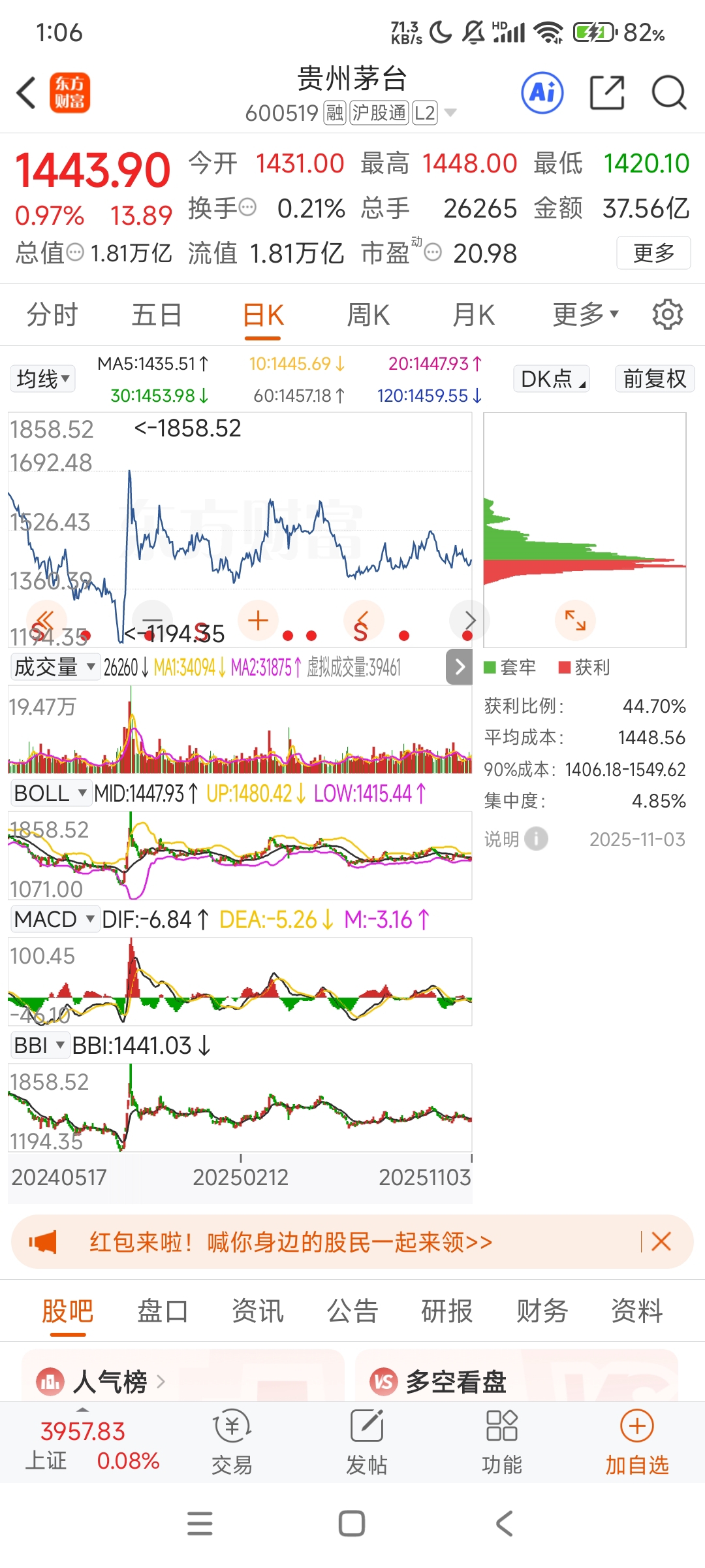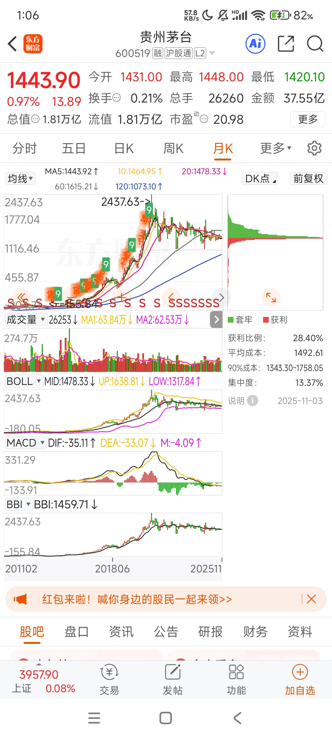 $贵州茅台(SH600519)$ 还有人说抄底茅台?告诉你茅台一直在这里震荡,就是在慢慢出货。万亿的盘子,不这样是出不了货的。会一直下跌,破千是无可厚非的。会跌无止境。