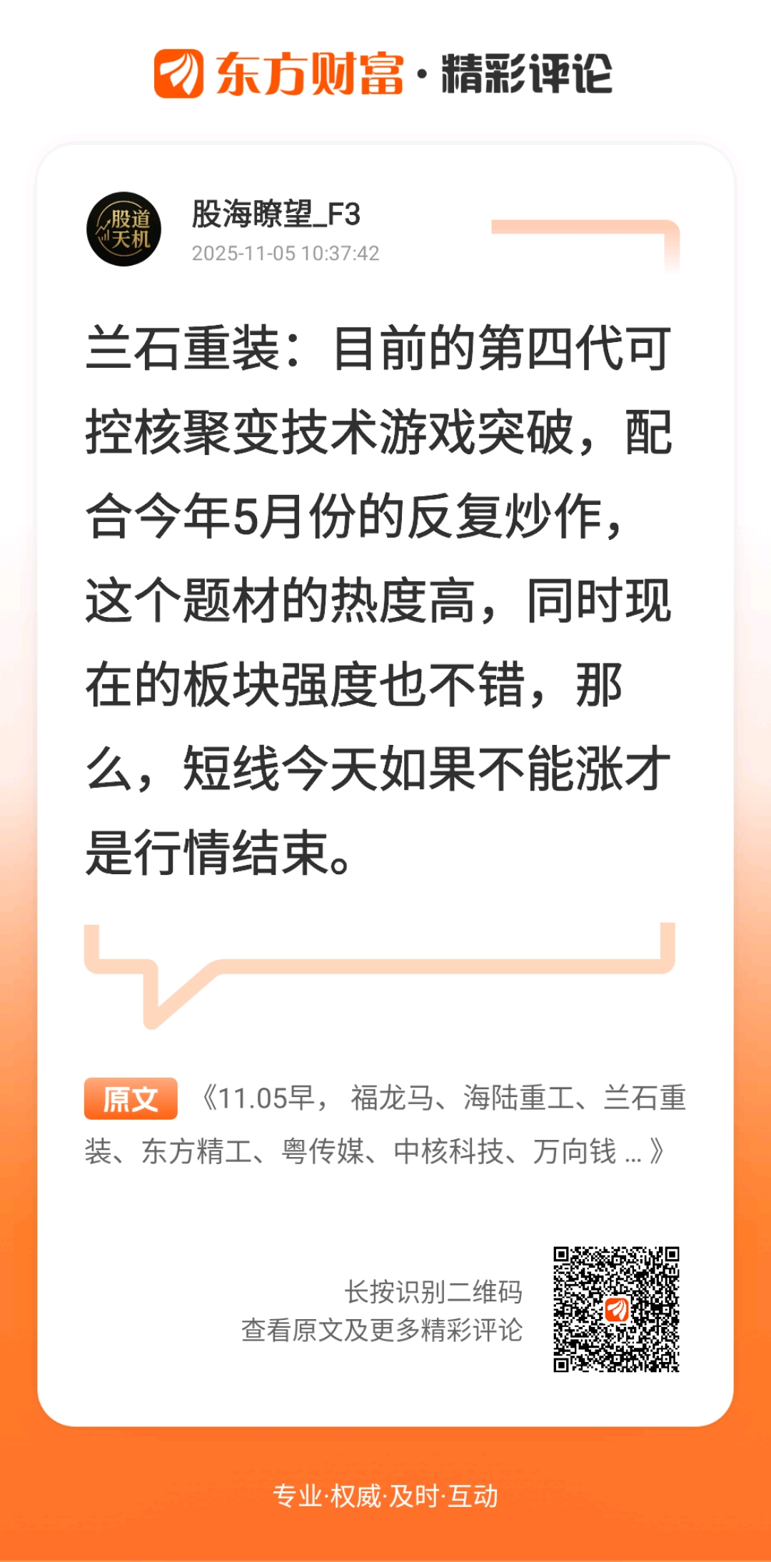 海陆重工:个股在昨天当中出现了大幅度的跳空高开以后,最终还是拉升收出涨停板的走势。目前来讲,公司更大的因素则是在昨天的走势里面,即使是出现了一字板涨停的情况,但是有个缺口放了部分的人事进来,而且当前的可控和聚变成为了市场当中的绝对主线。从技术结构形态上来讲,也是突破了日线级别的大箱体,走出连板的动能,而公司的目前的主营业务方面上来说,也是在当前参与最新的钍基熔盐实验。获得了相应的。研究经验,并且获得专家组的通过,所以在此情况之下直接相关。那么在这一次实验突破以后,将会对公司业绩形成正向的驱动力。而从技术结构形态目前来讲,中枢压制已经基本上消除,大的压制点位,短线上来说还有两个涨停板的空间。