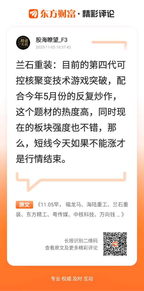 兰石重装:个股在昨天当中出现了跳空向上再次拉升收出涨停的走势,目前来讲可控核聚变方面有相当多的利好传出,特别是最新的可控核聚变的技术性突破来讲,那么对于这一整个行业的继续的商业化进程将会进一步加快。其次则是公司目前的。在当前核能工艺的设备合同当中来讲,也是进一步的获取,而且有订单。同时当前巩固了在核能领域的竞争力以及市场份额。当前在可控核聚变方面也是有相关的研究,在此情况之下,充分的收益这一轮的突破,其次则是昨天的涨停板,突破了当前日线级别的相提,而大的级别上来看,目前只剩下13元的压制点位,所以还有两个涨停板的空间。