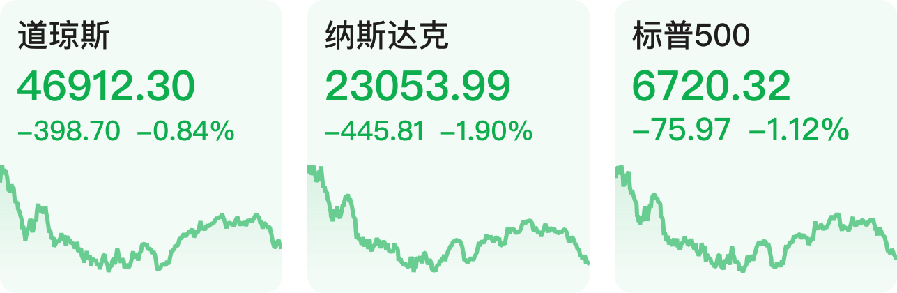 美股三大指数集体收跌,纳指跌1.9%,标普500指数跌1.12%,道指跌0.84%。英伟达、特斯拉跌超3%,热门中概股涨跌不一,纳斯达克中国金龙指数跌0.03%。小马智行跌超8%,金山云、名创优品跌逾3%;小鹏汽车涨超9%,百度涨超3%。