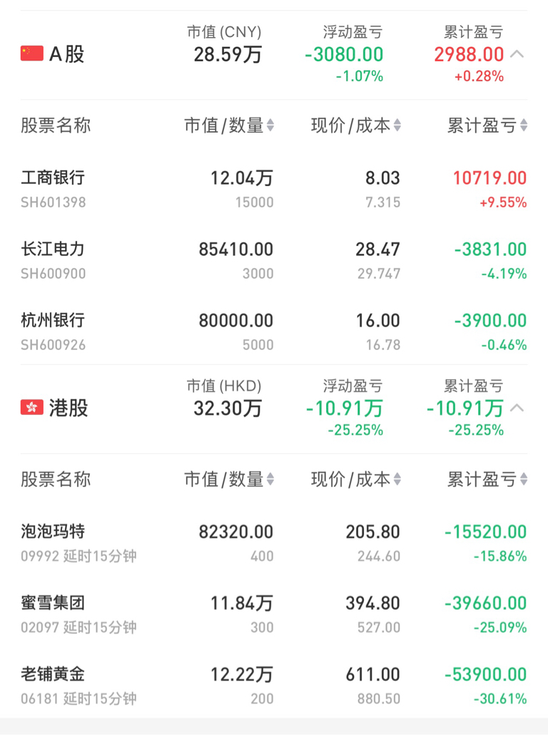 $贵州茅台(SH600519)$ $泡泡玛特(HK|09992)$ $老铺黄金(HK|06181)$ 这是当时吹的最狠的时候,我就建了个模拟仓,不算今天的涨跌幅,当时那些吹到天上去的人,在哪儿去了,不是什么新消费吗?年轻人不喜欢了?不是小登消费吗?