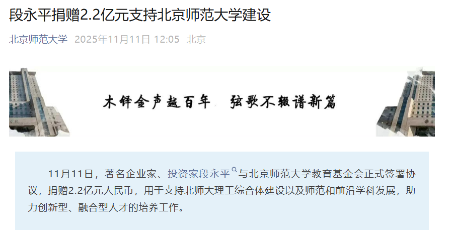 11月11日,北京师范大学微信公众号发布消息称,段永平与北京师范大学教育基金会正式签署协议,捐赠2.2亿元人民币,用于支持北师大理工综合体建设以及师范和前沿学科发展,助力创新型、融合型人才的培养工作。