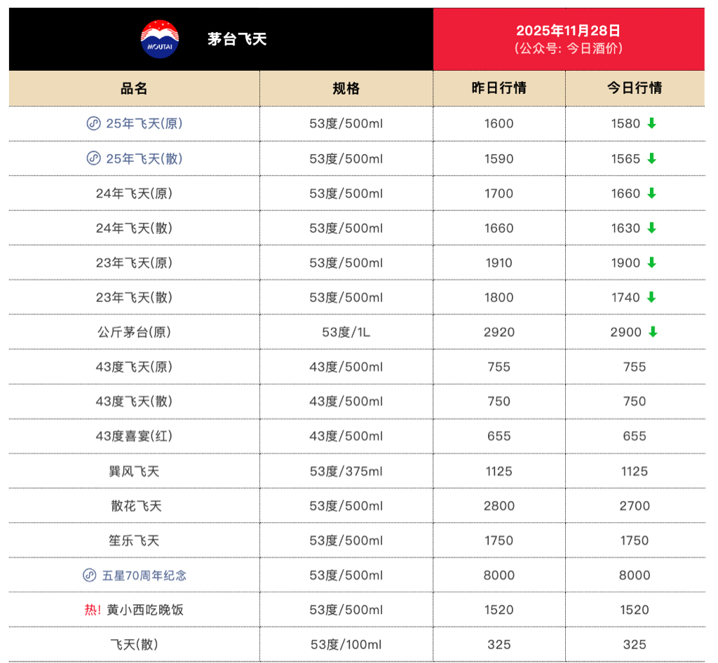 今日酒价披露的批发参考价显示,11月28日,25年飞天茅台原箱较前一日下跌20元