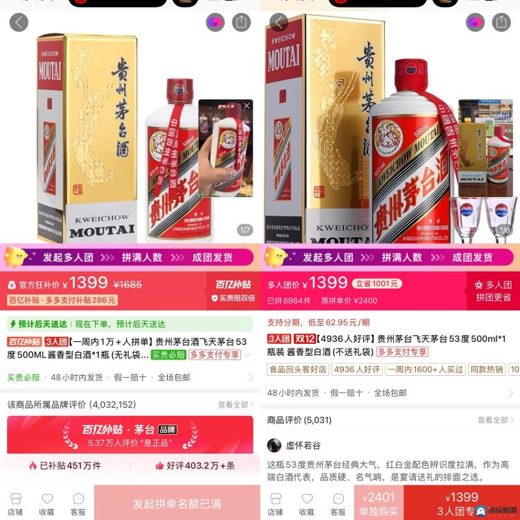 “1399元能抢到飞天茅台?”12月2日,拼多多平台多个食品类店铺同步上线飞天茅台拼团活动,标注“买贵赔双倍”“百亿补贴”的53度500ml飞天茅台,以1399元/瓶的价格开放3人团购买,且标注“48小时发货、无礼袋、假一赔十、限购1件”。