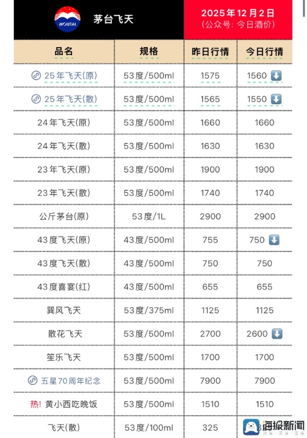 批发端,自11月27日批发价跌破1600元/瓶后,飞天茅台的批发价格持续下跌。据“今日酒价”报价,12月2日,飞天茅台53度500ml原箱批发价较前日下降15元/瓶,报1560/瓶;散瓶同样较前日下跌15元,报1550元/瓶。
