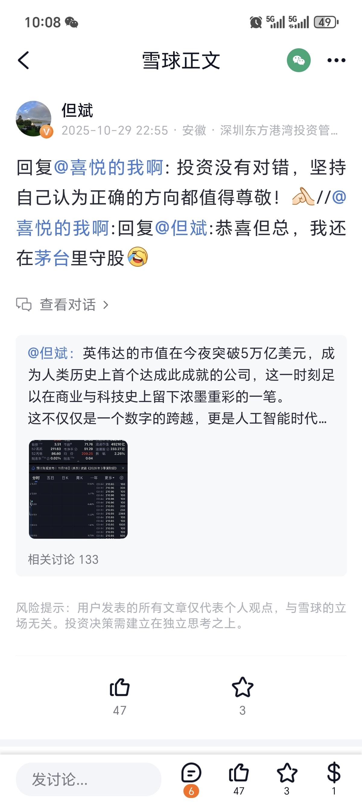 $贵州茅台(SH600519)$ 但斌雪球谈投资茅台,潜台词现在不认可投资茅台。你能想象这是一个之前著名的茅吹吗?看来时代真的变了。也佩服他,敢于亮出自己观点。