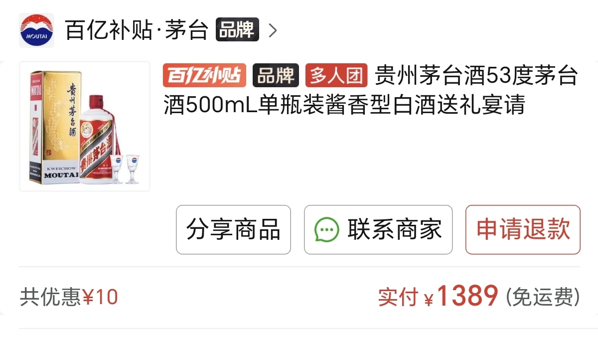 $贵州茅台(SH600519)$ 飞天茅台拼多多1389放量卖货,速来围观!!!