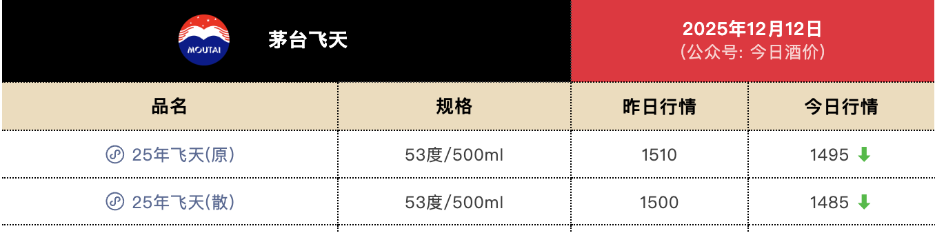 12月12日,第三方平台“今日酒价”数据显示,2025年53度500ml飞天茅台散瓶批发参考价已跌至1485元/瓶,原箱产品报价为1495元,均较前一日下跌15元,创历史新低。这一价格也是首次跌破1499元的官方指导价,较两款产品上线时的2220元、2255元累计跌幅均已超过30%。