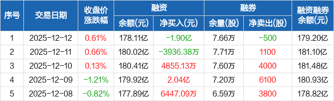 贵州茅台:融资净偿还1.9亿元,融资余额178.11亿元(12-12)