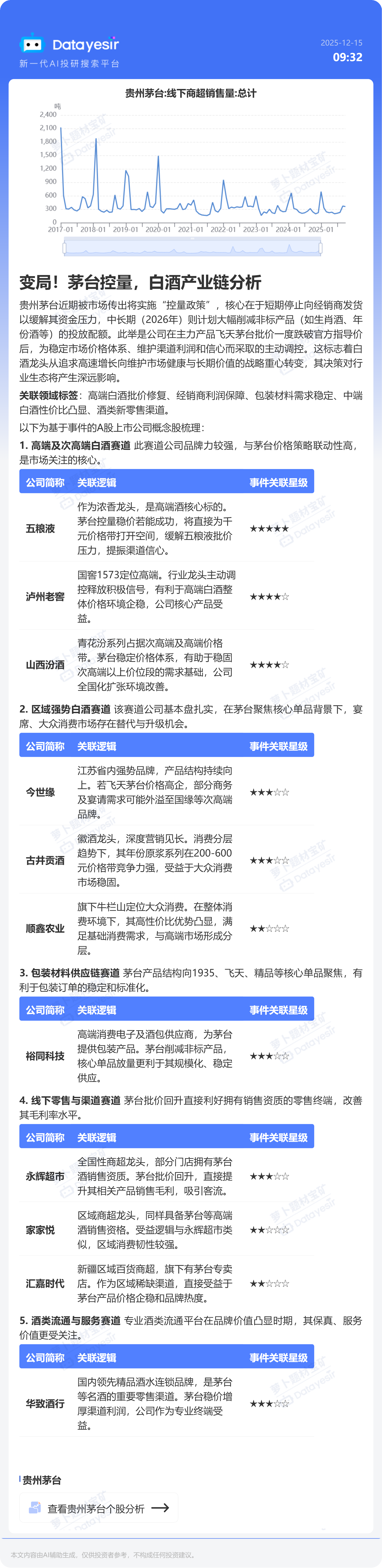 贵州茅台近期被市场传出将实施“控量政策”,核心在于短期停止向经销商发货以缓解其资金压力,中长期(2026年)则计划大幅削减非标产品(如生肖酒、年份酒等)的投放配额。此举是公司在主力产品飞天茅台批价一度跌破官方指导价后,为稳定市场价格体系、维护渠道利润和信心而采取的主动调控。