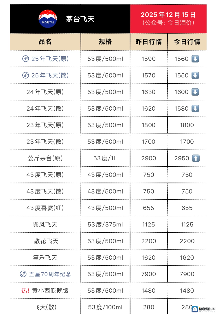 而12月15日,飞天茅台市场价格迎来新变化。继14日部分产品价格短暂冲高后,15日多款飞天茅台产品价格出现下调,“今日酒价”报价数据显示,25年飞天散瓶(53度/500ml)的批发参考价较前日下跌30元,降至1560元/瓶;公斤茅台较前日上涨50元,涨至2950元/瓶。而部分纪念款、特殊规格产品价格则保持稳定,市场零售端的价格波动也同步显现,当日,济南部分烟酒店的飞天茅台散瓶的零售价格在1595元/瓶至1600元/瓶,原箱零售价在1650元/瓶上下,经销商与消费者对后续行情表现出不同程度的观望态度。