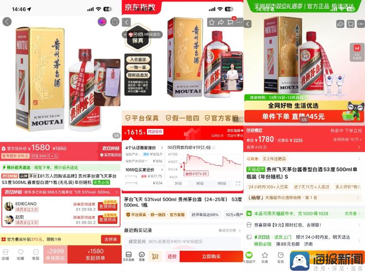 12月15日,飞天茅台网络平台价格,从左至右依次是拼多多平台,京东平台,淘宝平台。